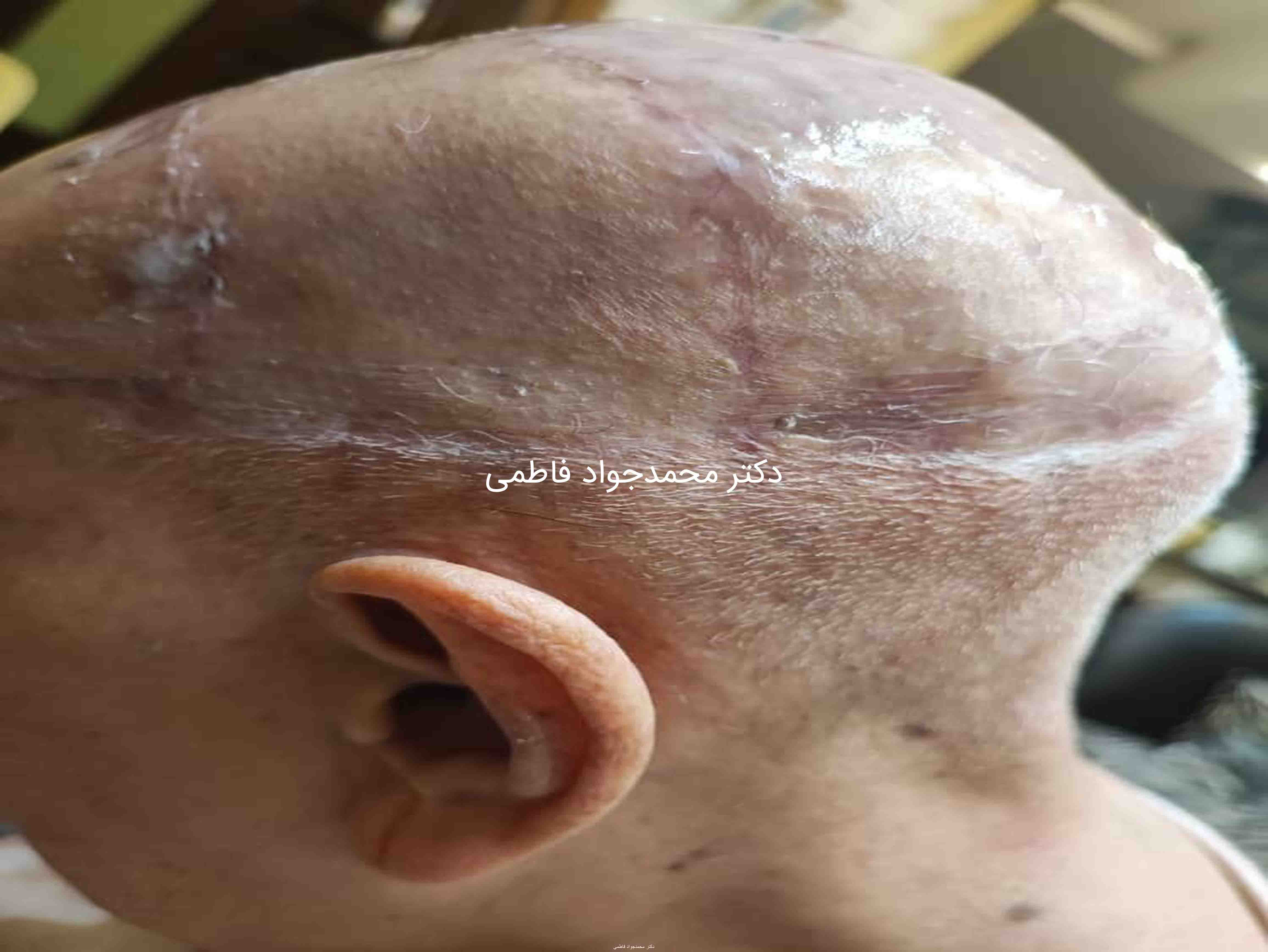 قبل عمل: تومور متعدد پوست سر به دنبال رادیوتراپی در دوران کودکی که تمام پوست سر صدمه خورده است. بعد عمل:پوشش کامل سر با پیوند پوست با وسعت 40در20 سانتی متر مربع.