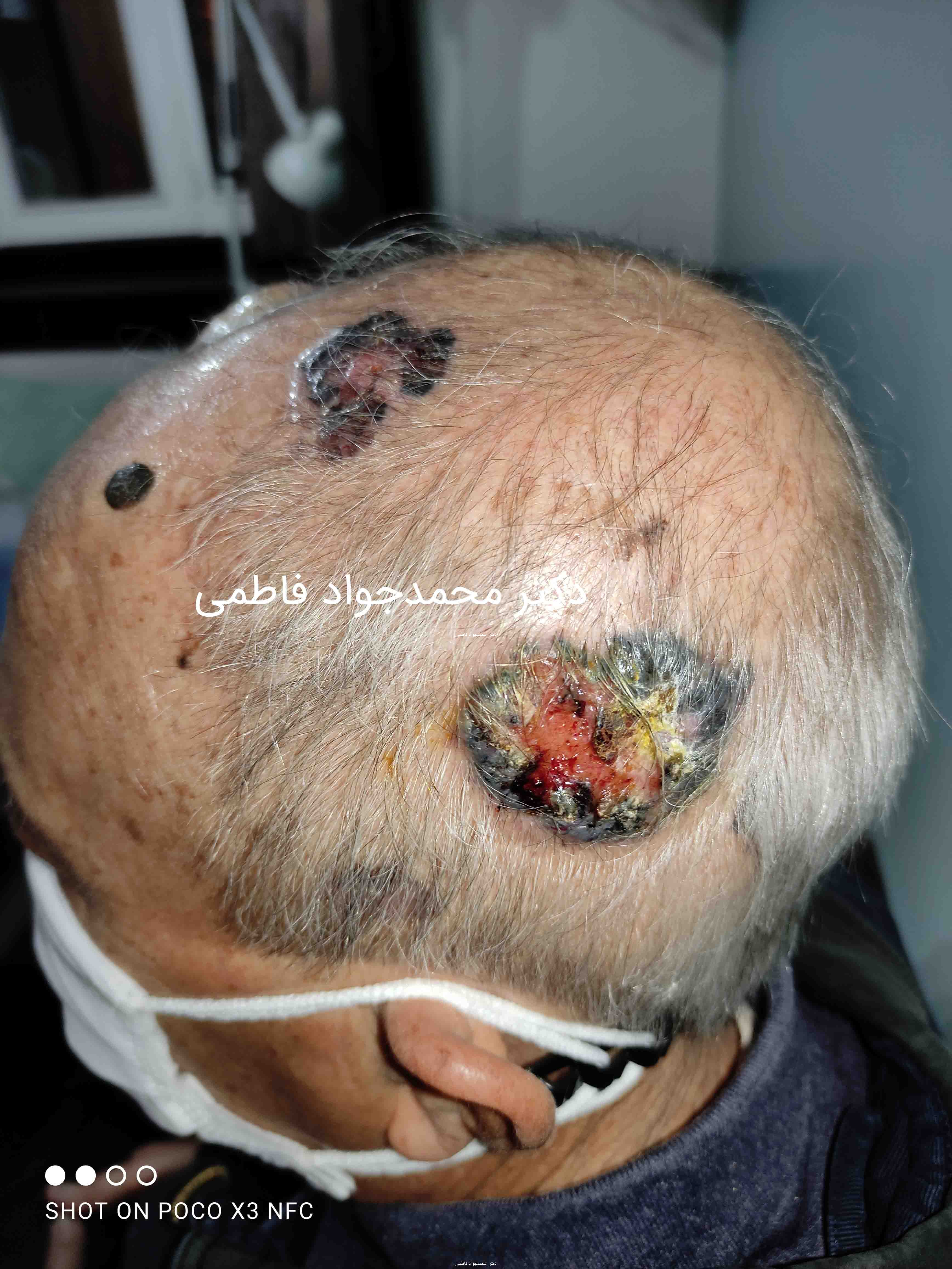 قبل عمل: سرطان سلولهای شاخی (scc) چندین بار عمل جراحی ناموفق داشتهاند. | بعد از عمل: ترمیم کامل فلپ و گرافت پوستی.